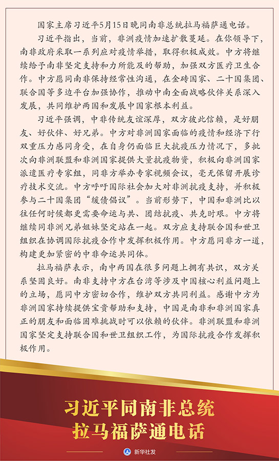 習(xí)近平指出,當(dāng)前,非洲疫情加速擴(kuò)散蔓延。在你領(lǐng)導(dǎo)下,南非政府采取一系列應(yīng)對(duì)疫情舉措,取得積極成效。中方將繼續(xù)給予南非堅(jiān)定支持和力所能及的幫助,加強(qiáng)雙方醫(yī)療衛(wèi)生合作。中方愿同南非保持經(jīng)常性溝通,在金磚國(guó)家、二十國(guó)集團(tuán)、聯(lián)合國(guó)等多邊平臺(tái)加強(qiáng)協(xié)作,推動(dòng)中南全面戰(zhàn)略伙伴關(guān)系深入發(fā)展,共同維護(hù)兩國(guó)和發(fā)展中國(guó)家根本利益。