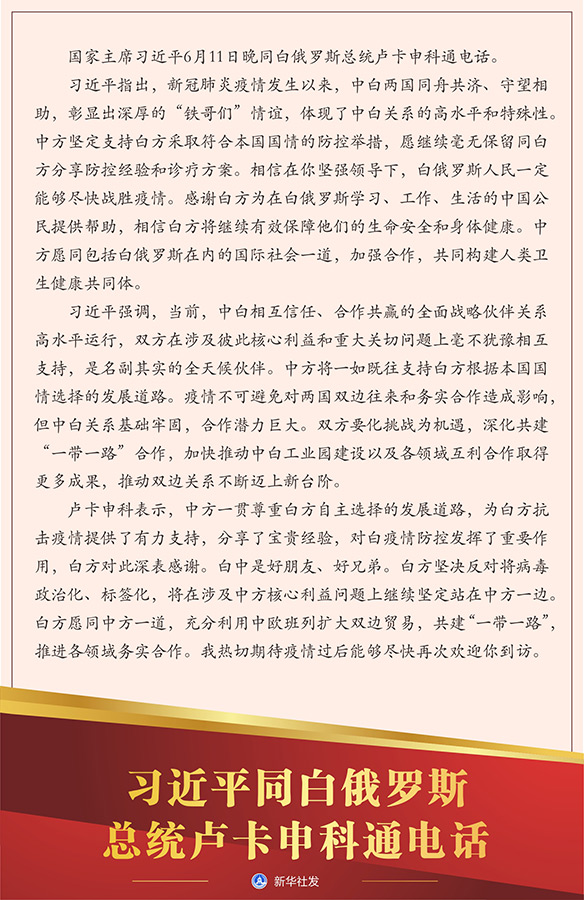 習(xí)近平指出,新冠肺炎疫情發(fā)生以來,中白兩國同舟共濟(jì)、守望相助,彰顯出深厚的“鐵哥們”情誼,體現(xiàn)了中白關(guān)系的高水平和特殊性。中方堅定支持白方采取符合本國國情的防控舉措,愿繼續(xù)毫無保留同白方分享防控經(jīng)驗和診療方案。相信在你堅強(qiáng)領(lǐng)導(dǎo)下,白俄羅斯人民一定能夠盡快戰(zhàn)勝疫情。感謝白方為在白俄羅斯學(xué)習(xí)、工作、生活的中國公民提供幫助,相信白方將繼續(xù)有效保障他們的生命安全和身體健康。中方愿同包括白俄羅斯在內(nèi)的國際社會一道,加強(qiáng)合作,共同構(gòu)建人類衛(wèi)生健康共同體。