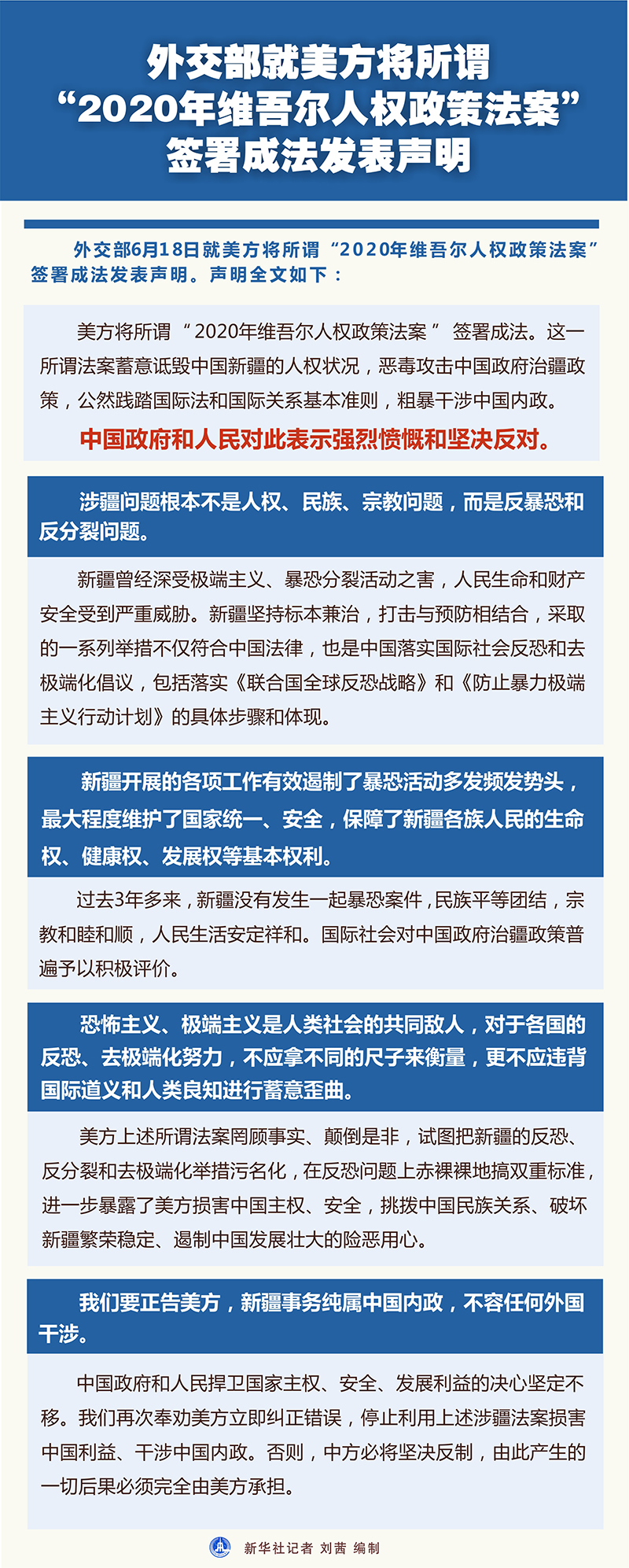 美方將所謂“2020年維吾爾人權(quán)政策法案”簽署成法。這一所謂法案蓄意詆毀中國(guó)新疆的人權(quán)狀況,惡毒攻擊中國(guó)政府治疆政策,公然踐踏國(guó)際法和國(guó)際關(guān)系基本準(zhǔn)則,粗暴干涉中國(guó)內(nèi)政。中國(guó)政府和人民對(duì)此表示強(qiáng)烈憤慨和堅(jiān)決反對(duì)。