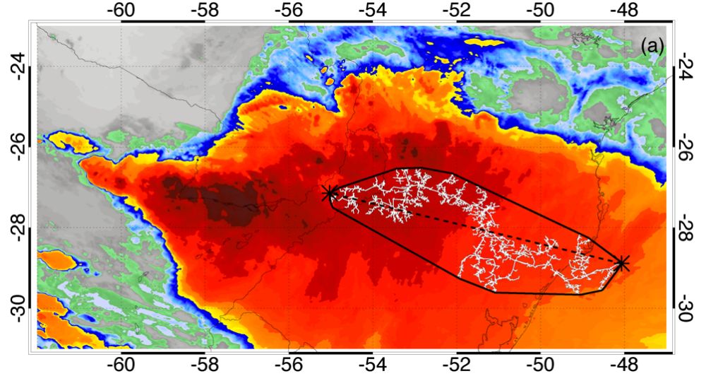 衛(wèi)星照片:?jiǎn)未伍L(zhǎng)度最長(zhǎng)閃電2018年10月31日發(fā)生在巴西南部。(圖片來源:世界氣象組織網(wǎng)站)