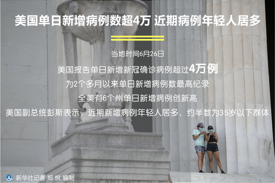 新華社華盛頓6月26日電(記者譚晶晶)美國(guó)26日?qǐng)?bào)告單日新增新冠確診病例超過4萬例,為2個(gè)多月以來單日新增病例數(shù)最高紀(jì)錄。全美有6個(gè)州單日新增病例創(chuàng)新高。美國(guó)副總統(tǒng)彭斯表示,近期新增病例年輕人居多,約半數(shù)為35歲以下群體。