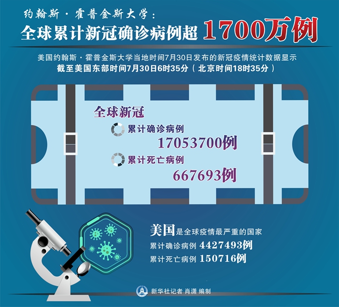 新華社紐約7月30日電 美國約翰斯·霍普金斯大學(xué)30日發(fā)布的新冠疫情統(tǒng)計(jì)數(shù)據(jù)顯示,截至美國東部時(shí)間30日6時(shí)35分(北京時(shí)間18時(shí)35分),全球累計(jì)確診病例達(dá)到17053700例,累計(jì)死亡667693例。
