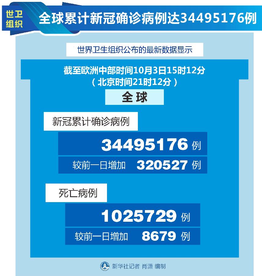 新華社日內(nèi)瓦10月3日電(記者劉曲)世界衛(wèi)生組織3日公布的最新數(shù)據(jù)顯示,全球累計新冠確診病例達(dá)34495176例。