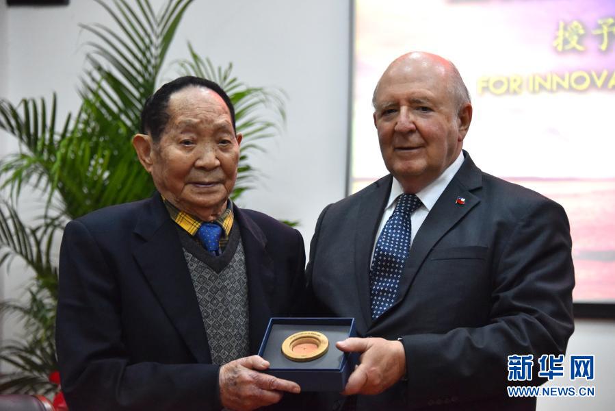 11月16日,智利駐華大使路易斯·施密特·蒙特斯向袁隆平頒發(fā)“中智建交50周年紀(jì)念獎(jiǎng)?wù)隆?。新華社記者 周勉 攝