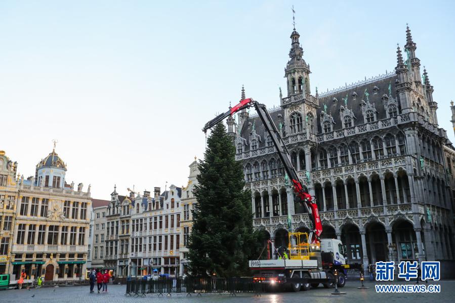 這是11月19日在比利時(shí)布魯塞爾大廣場(chǎng)拍攝的圣誕樹(shù)安裝現(xiàn)場(chǎng)。