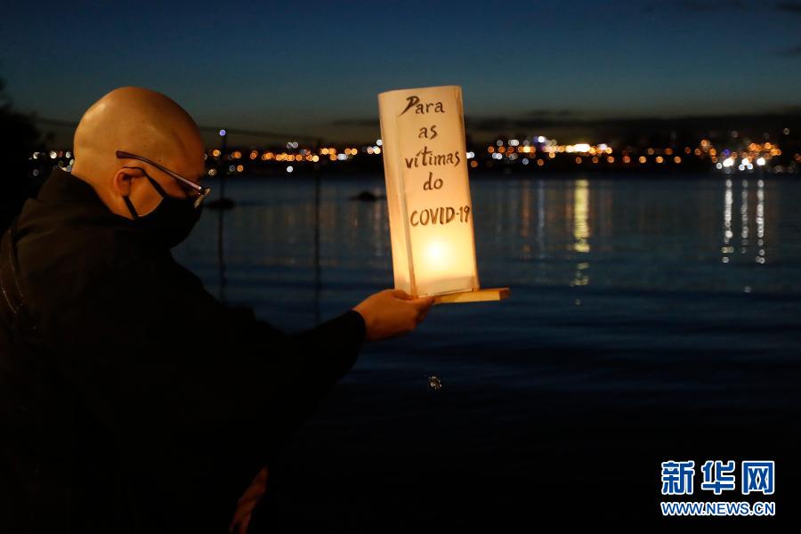 11月30日,在巴西首都巴西利亞,一名男子往湖中放入水燈,上面用葡萄牙文寫著“獻給新冠逝者”。新華社發(fā)(盧西奧·塔沃拉攝)