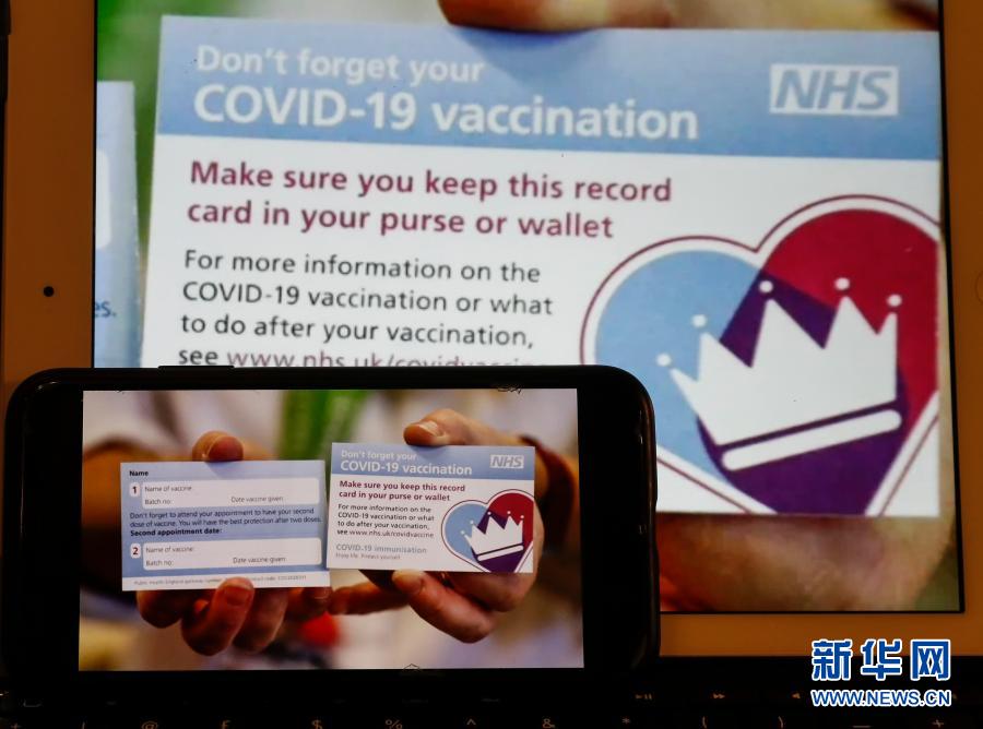 這是12月8日在英國(guó)倫敦拍攝的顯示新冠疫苗接種卡的電腦屏幕和手機(jī)屏幕。