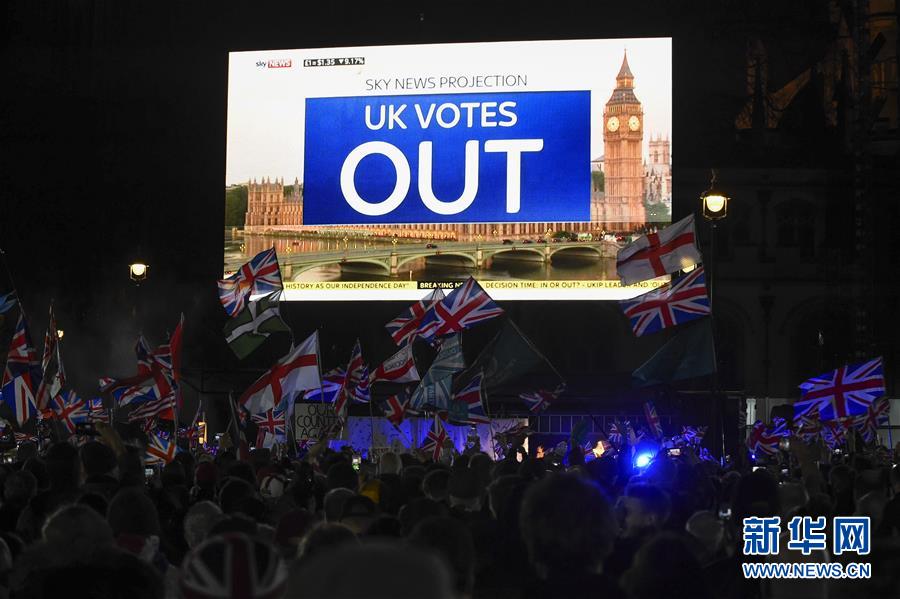 2020年1月31日晚,在英國倫敦,支持“脫歐”的人們在議會廣場集會,慶?!懊摎W”。大屏幕上顯示“英國選擇脫歐”。 新華社發(fā)(史蒂芬·程攝)