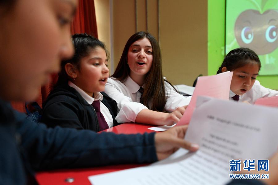 2019年10月11日,洛蕾托·約斯(中)在智利南部紐夫萊大區(qū)的圣尼古拉斯中學(xué)的課堂上學(xué)習(xí)漢語(yǔ)。新華社發(fā)(豪爾赫·比列加斯攝)