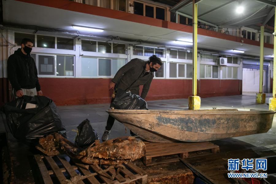 12月17日,在希臘比雷埃夫斯地區(qū)一處港口,阿拉帕基斯(右)與同事一同收集剛從漁船上卸下的塑料垃圾。新華社發(fā)(萊夫特里斯·帕察里斯攝)