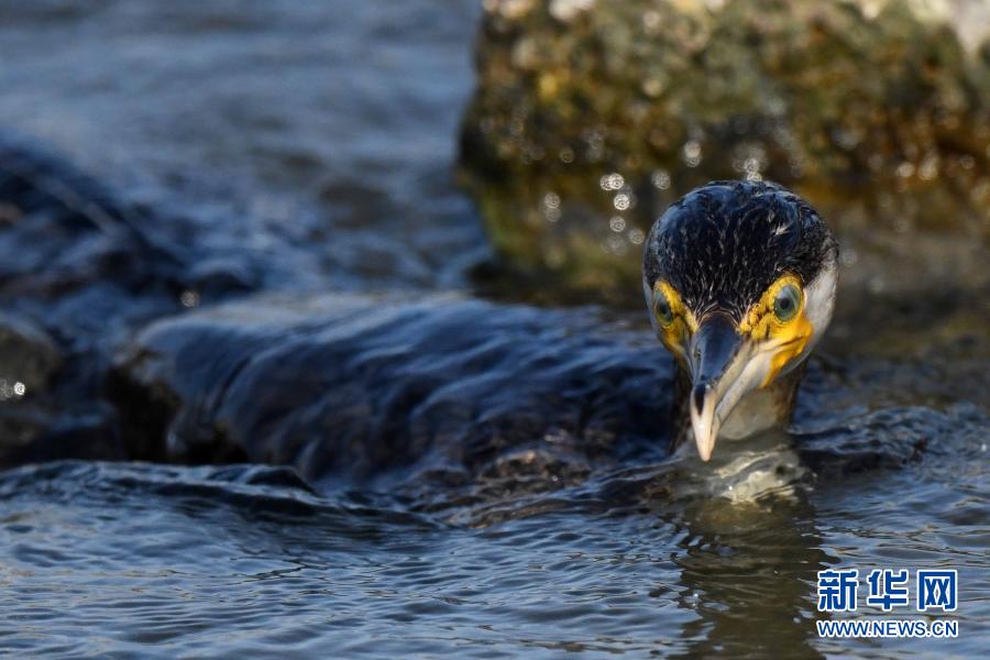 12月20日,一只鸕鶿在科威特杰赫拉省海邊覓食。