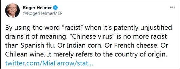 大量網(wǎng)友在他的這條推特下,挖出赫爾默曾經(jīng)發(fā)表的言論。例如早在3月17日,赫爾默就在一條推特中宣稱(chēng):“在明顯不合理的情況下,使用‘種族主義’這個(gè)詞會(huì)讓它失去意義?!袊?guó)病毒’和‘西班牙流感’一樣不是種族主義。就像印度玉米,或法國(guó)奶酪,或者智利葡萄酒。它僅僅是指原產(chǎn)國(guó)。”