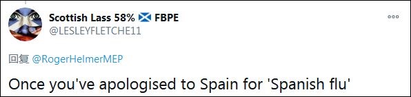 另一名網(wǎng)友接茬說(shuō):“只要你為‘西班牙流感’向西班牙道歉?!焙諣柲苍栌谩拔靼嘌懒鞲小?,為“中國(guó)流感”的說(shuō)法狡辯。
