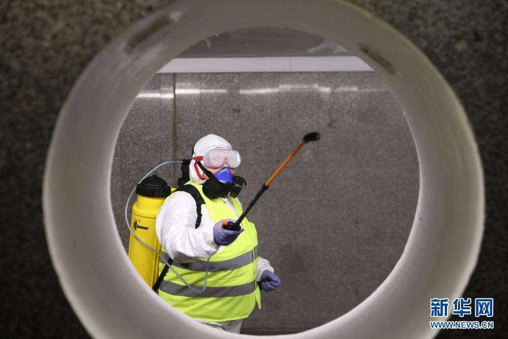 4月10日,工作人員在波蘭華沙為公共場(chǎng)所消毒。