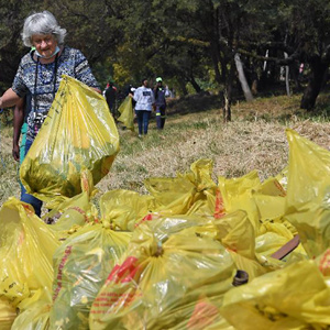 4月22日,南非比勒陀利亞的志愿者在河道邊清理垃圾。