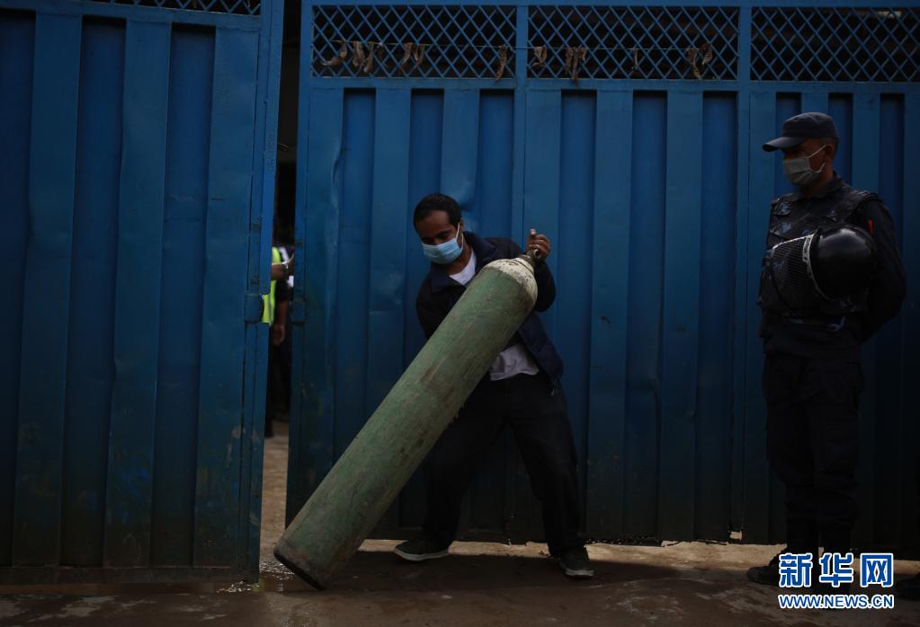 5月13日,一名尼泊爾男子在加德滿都搬運(yùn)氧氣罐。