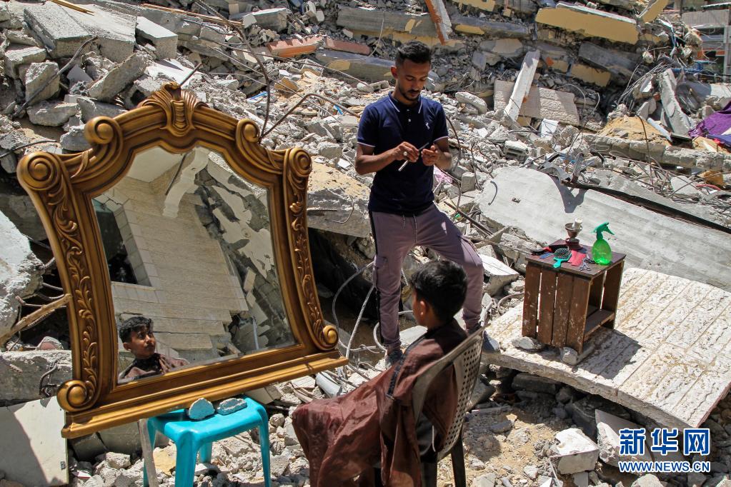 5月26日,在加沙地帶北部的城鎮(zhèn)貝特拉希亞,23歲的巴勒斯坦理發(fā)師阿卜杜拉·扎瓦拉在他被以色列炸毀的房屋前為顧客免費服務。 新華社發(fā)(里澤克·阿卜杜勒·賈瓦德攝)