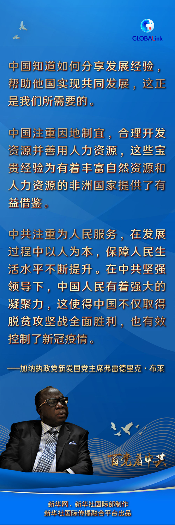 布萊對中國共產(chǎn)黨成立100周年表示祝賀。他祝愿中國在中共領(lǐng)導(dǎo)下取得更多成功,促進(jìn)世界和平繁榮穩(wěn)定,同時希望加納新愛國黨和中共在未來能有更多交流合作。