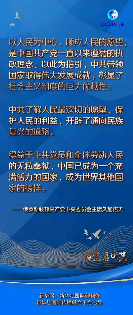 久加諾夫?qū)χ袊?guó)共產(chǎn)黨百年華誕表示祝賀?;仡櫚倌隁v程,他表示,中共了解人民最深切的愿望,保護(hù)人民的利益,開辟了通向民族復(fù)興的道路。