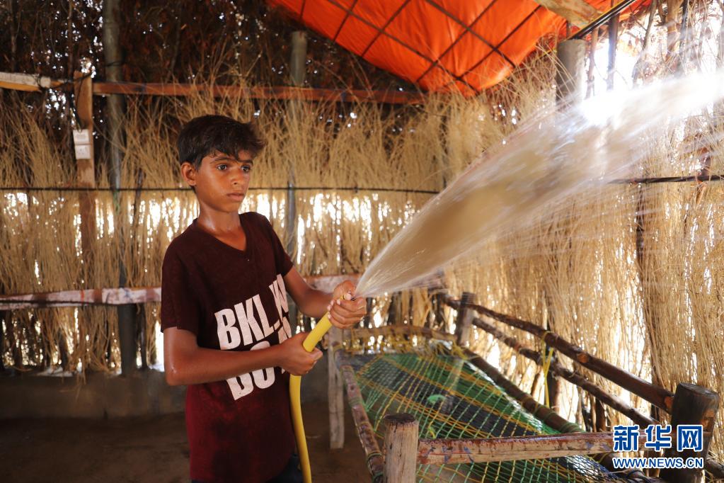 6月17日,一名男孩在也門北部哈杰省的一座難民營內(nèi)給自家的茅草屋澆水降溫。